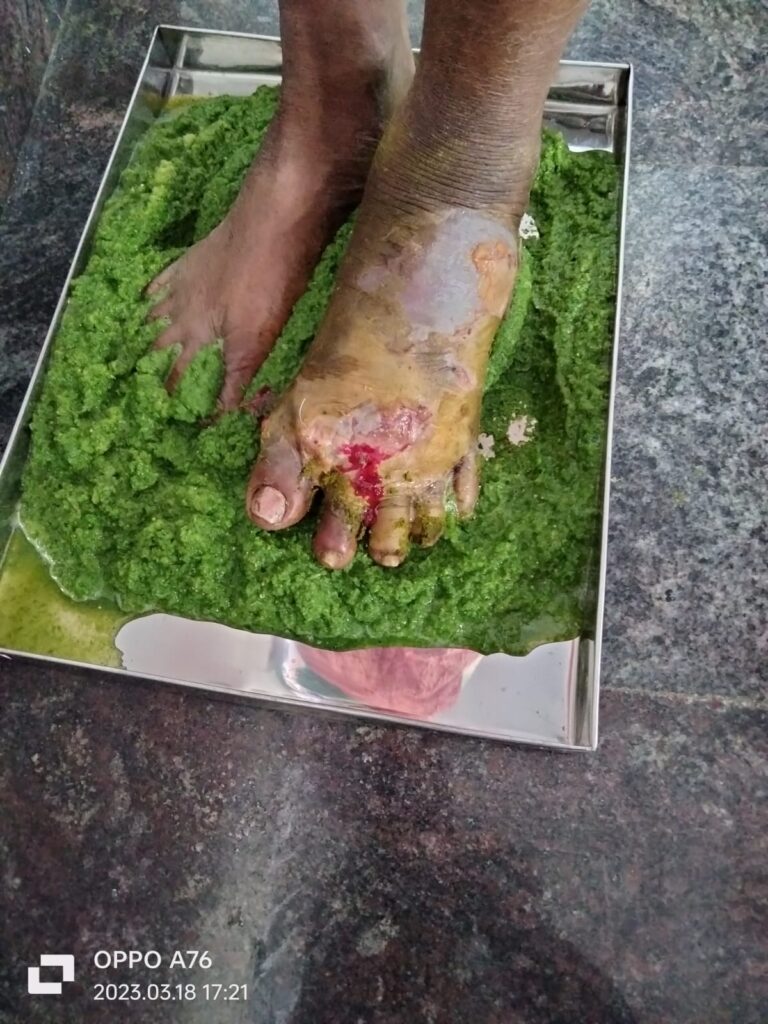The patients asked to keep foot and press continuously on the Prepared grinded paste of using neem and bitter gourd leaves, this therapy aims to reduce inflammatory accumulation, clear metabolic obstruction, and support systemic detoxification.