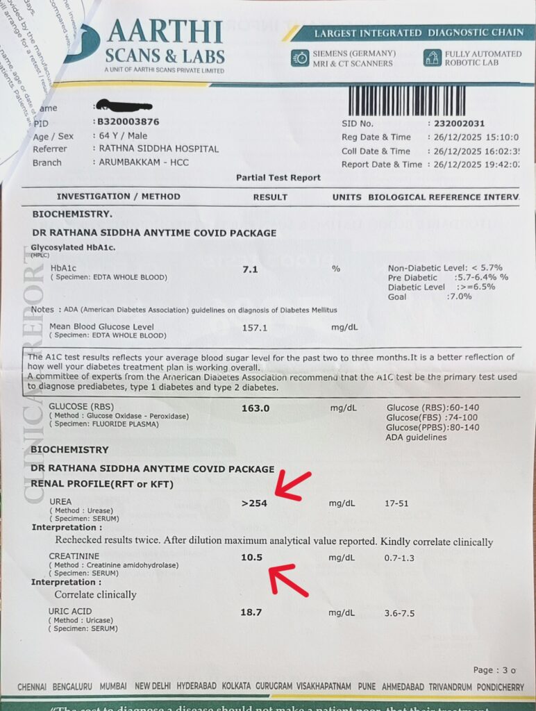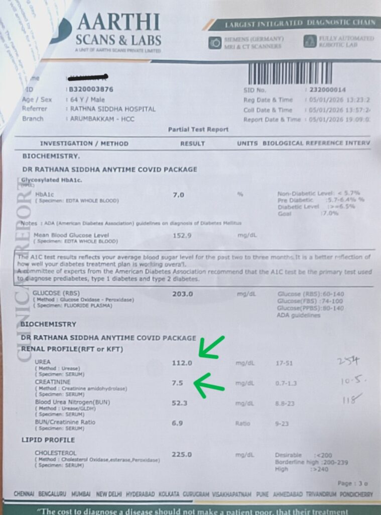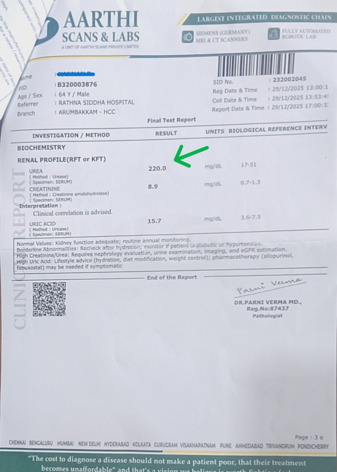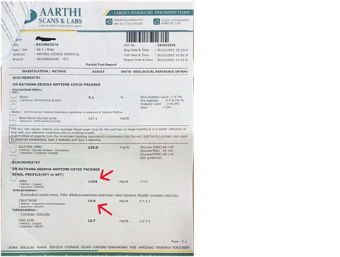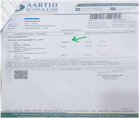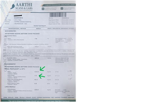 The patient was advised to go for a blood laboratory test. The parameters reflected critical renal compromiselike: