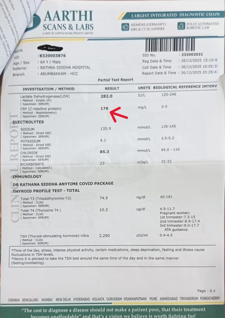 CRP: 176 mg/dL (Severe systemic inflammation)